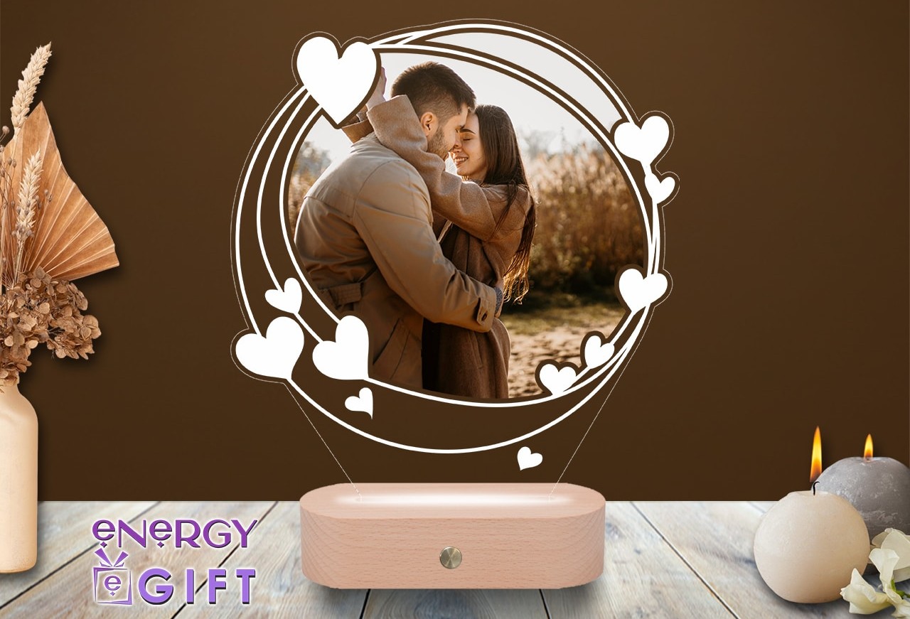 Un exemplu deosebit este lampa LED 3D personalizată cu ramă foto și inimioare, creată special pentru îndrăgostiți. Aceasta reunește într-un singur obiect frumusețea luminii ambientale, amintirea unei fotografii dragi și simbolistica iubirii.